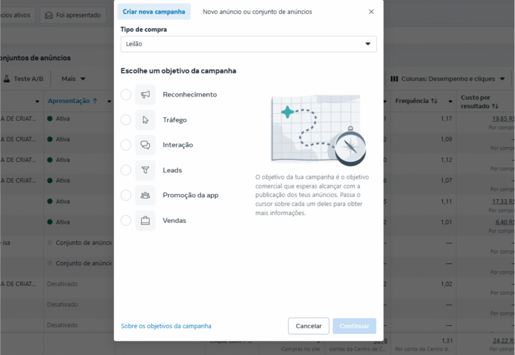 Você vai ver, passo a passo, como montar seu primeiro anúncio: escolher objetivo, imagem, texto e botão certo. Tudo guiado para que você não fique travado em nenhuma etapa.